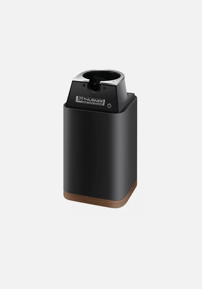 Ein besonderes Highlight ist der stilvolle Holzfuß, der mit seiner natürlichen Wärme einen harmonischen Kontrast zum Aluminium bildet. So wird der Siebträger-Reiniger nicht nur zu einem unverzichtbaren Helfer, sondern auch zu einem echten Blickfang in Ihrer Küche oder Ihrem Café.